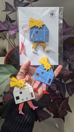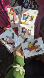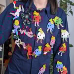 The brooches are hand-painted and made of MDF with 3D-printed pins for joints, which allow them to move like marionettes.